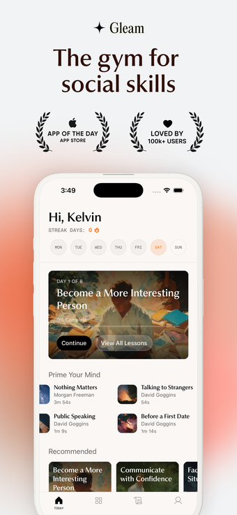 Gleam: Charisma Confidence — это бесплатное приложение для iPhone, сосредоточенное на саморазвитии через интерактивное обучение. Оно предлагает разнообразные короткие уроки, разработанные для улучшения навыков общения, повышения уверенности и формирования значимых отношений. Пользователи могут участвовать в обучении на основе сценариев, охватывающем важные темы, такие как публичные выступления, переговоры и активное слушание. Приложение использует научно обоснованные стратегии, чтобы помочь пользователям эффективно справляться с социальными взаимодействиями и управлять тревожностью.